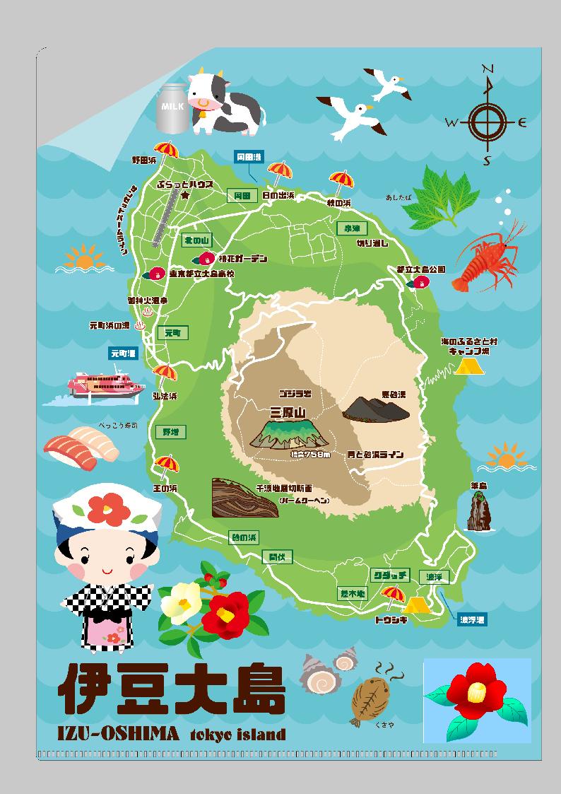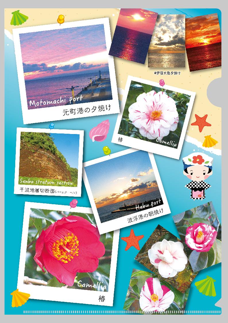 クリアファイルは伊豆大島の地図と椿や夕焼けを取り入れ、
