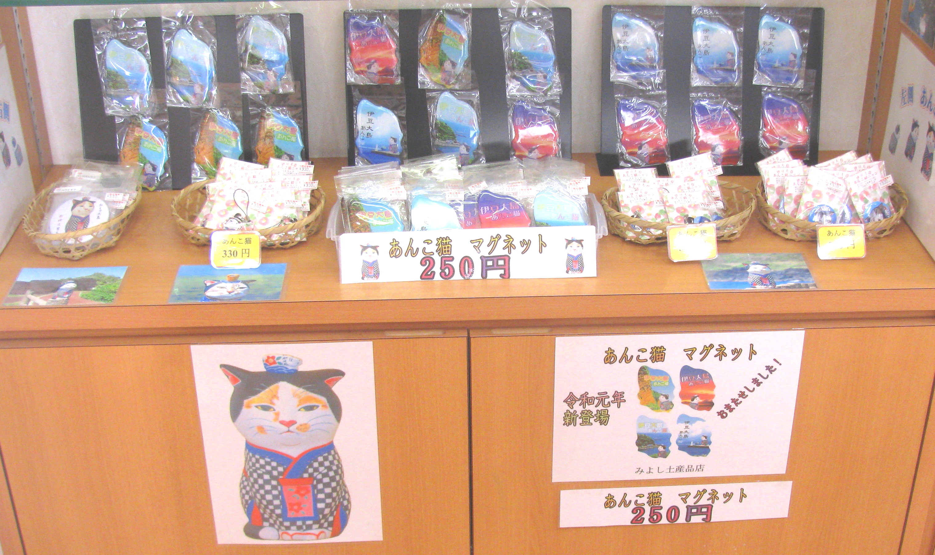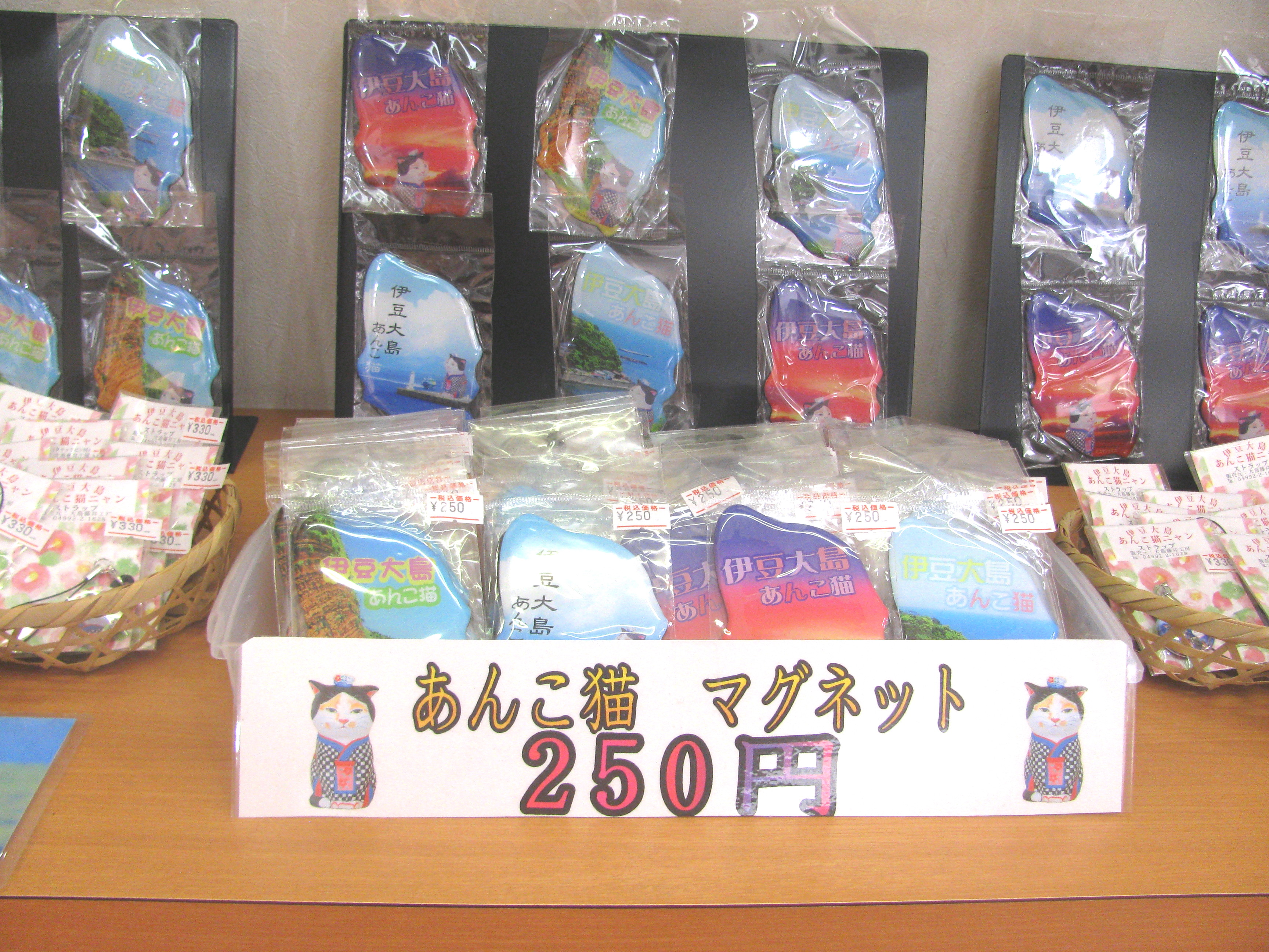 伊豆大島の人気キャラクターあんこ猫グッズのお土産商品です。