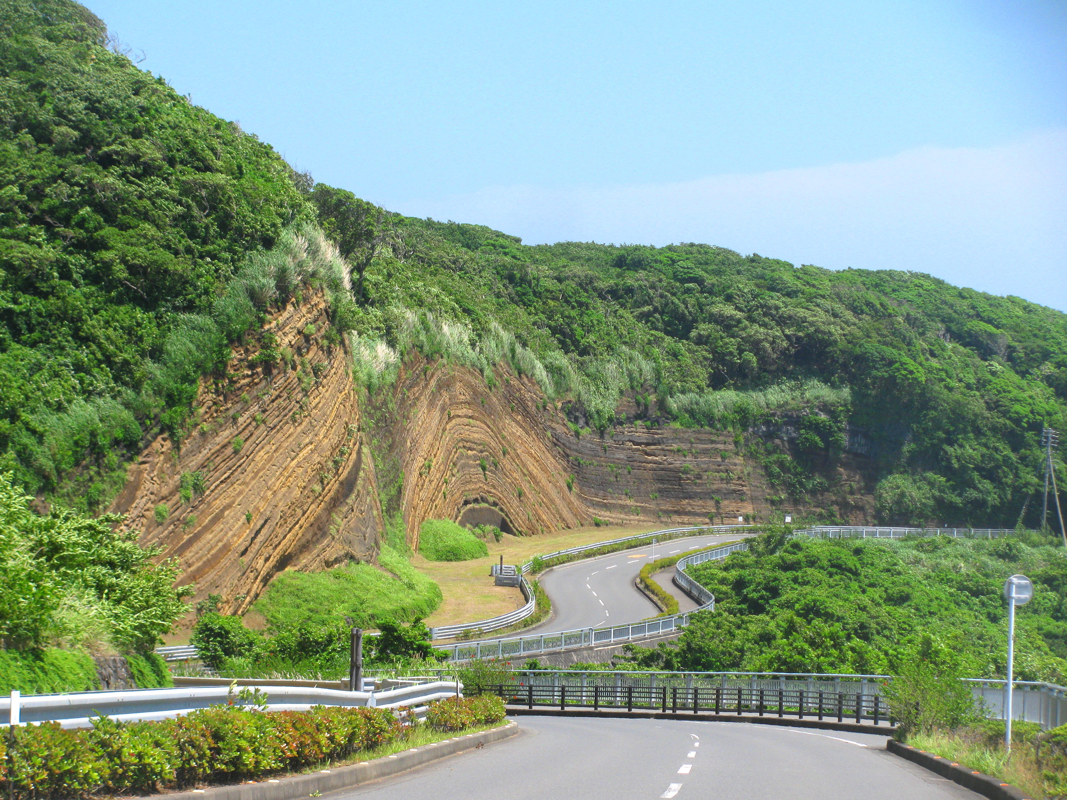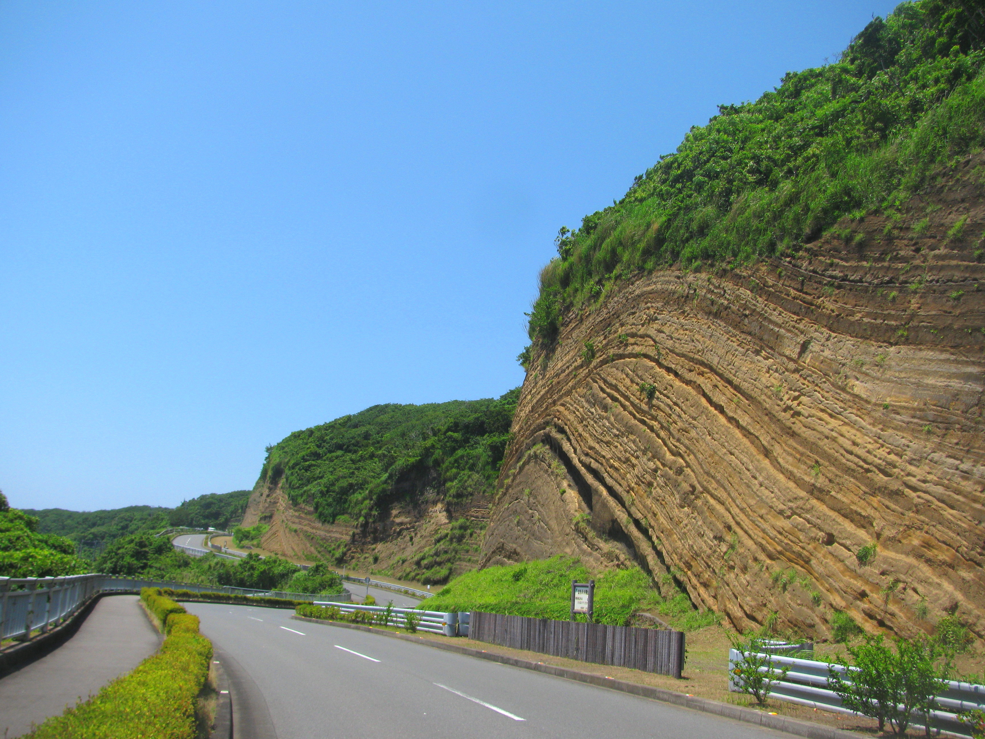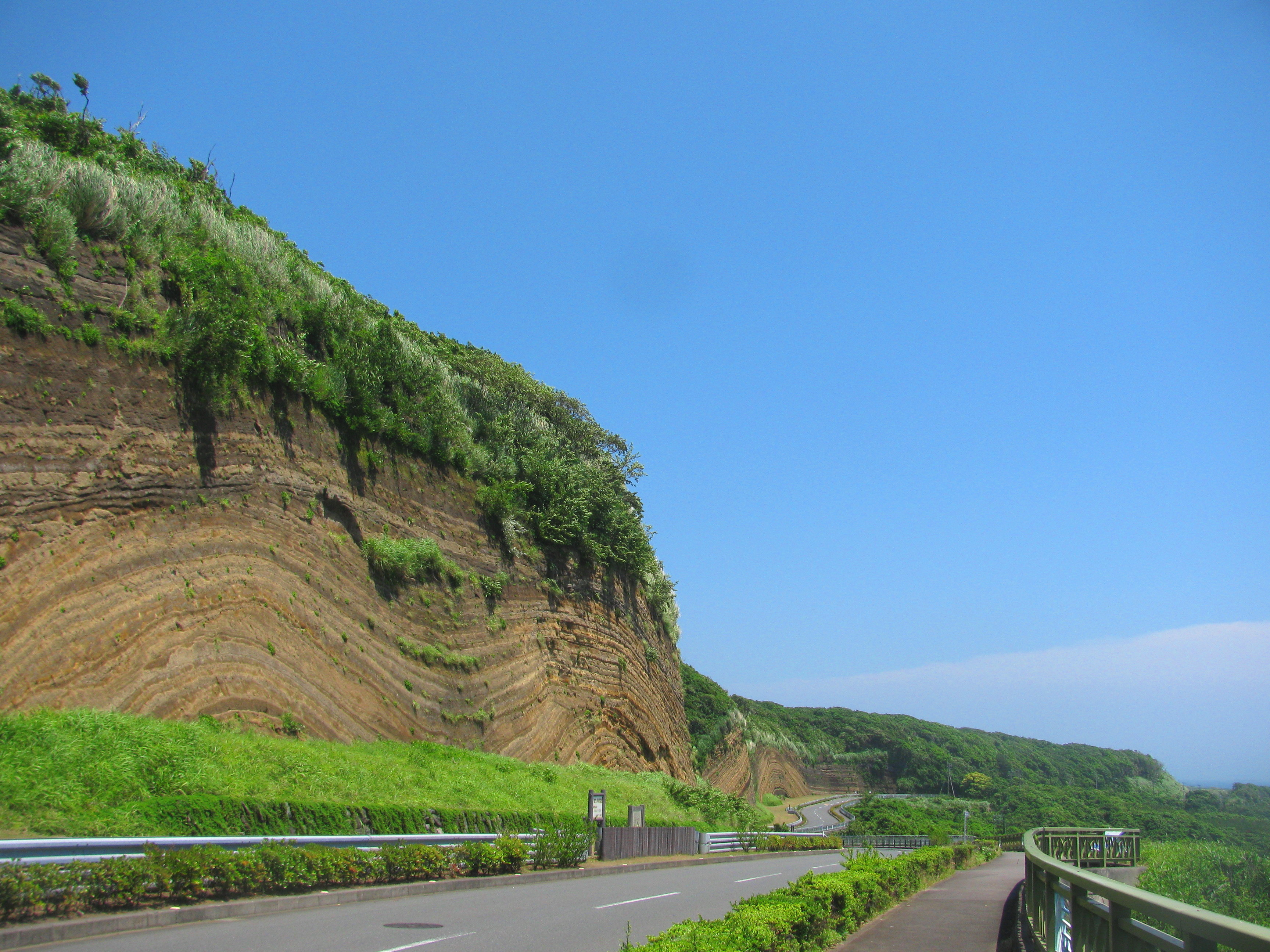 千波地層切断面は元町から波浮港方面へ行く通りにあり、大島一周道路上で必ず通ります。