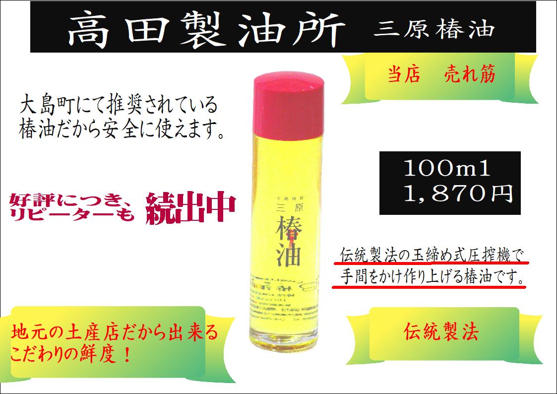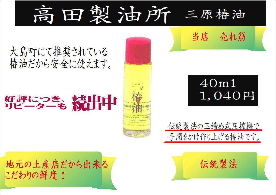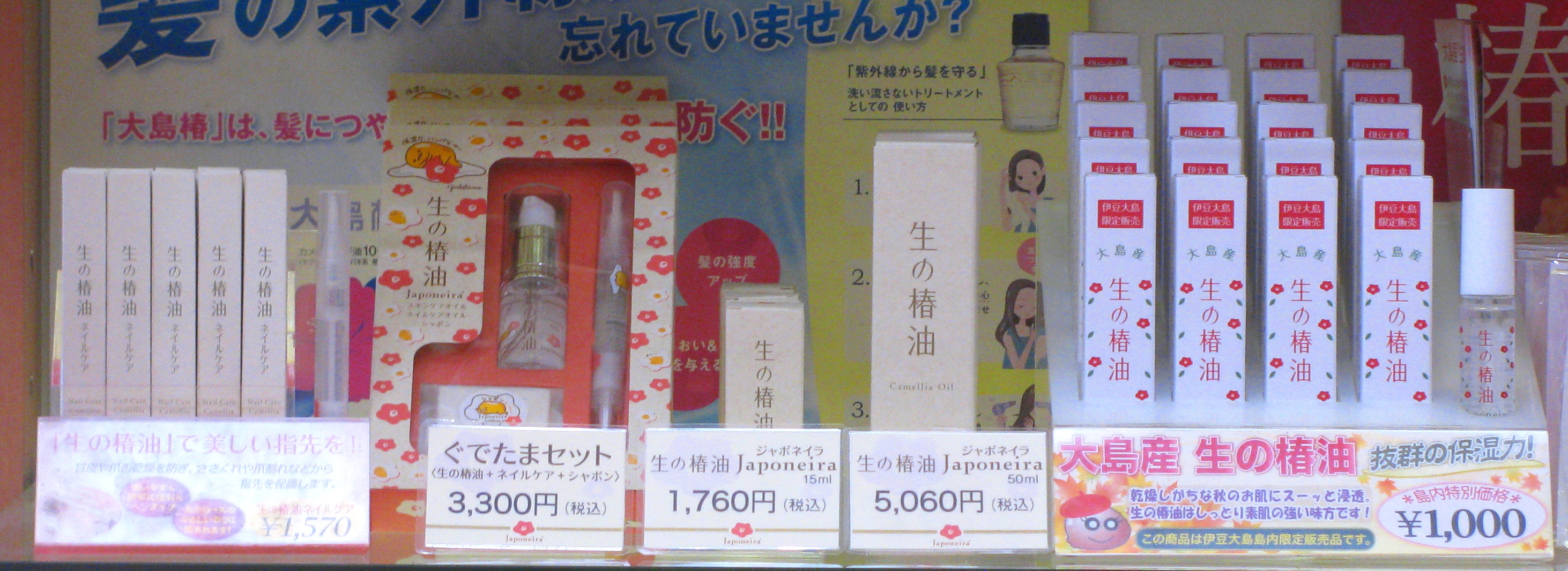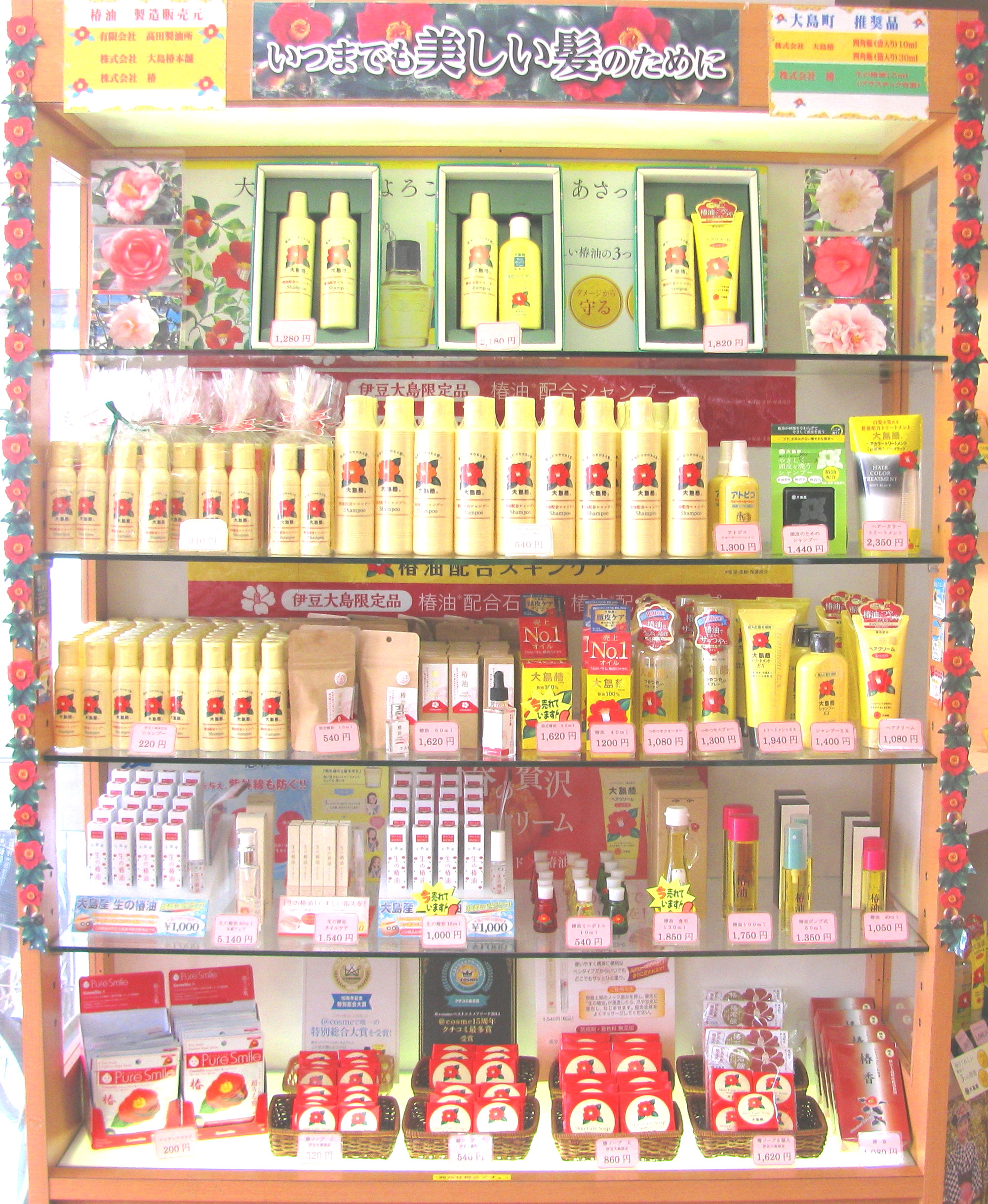 - 大島町推奨品が多数あり、 伊豆大島限定品の椿油が売れ筋商品です。