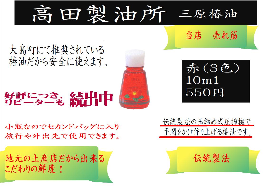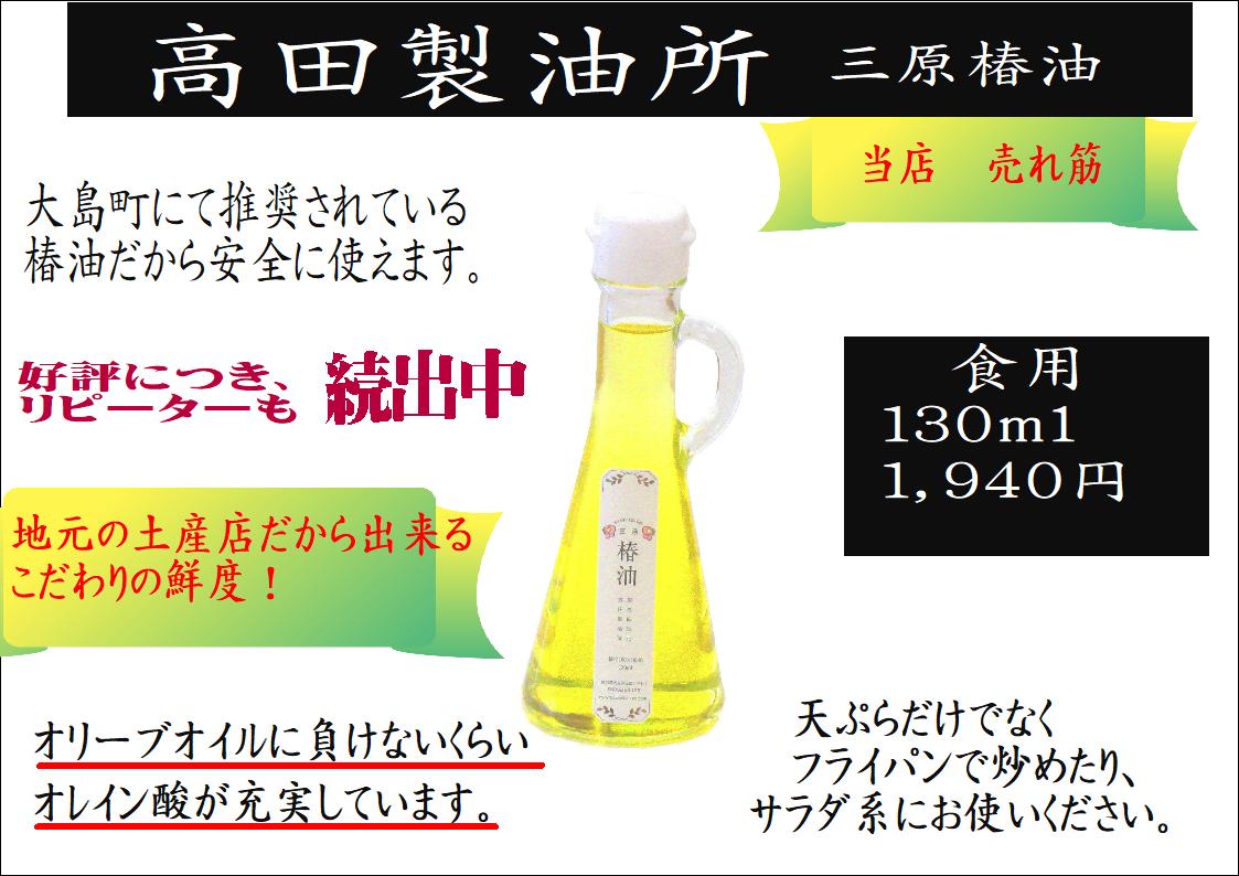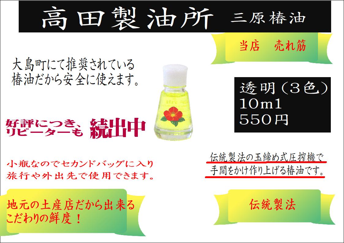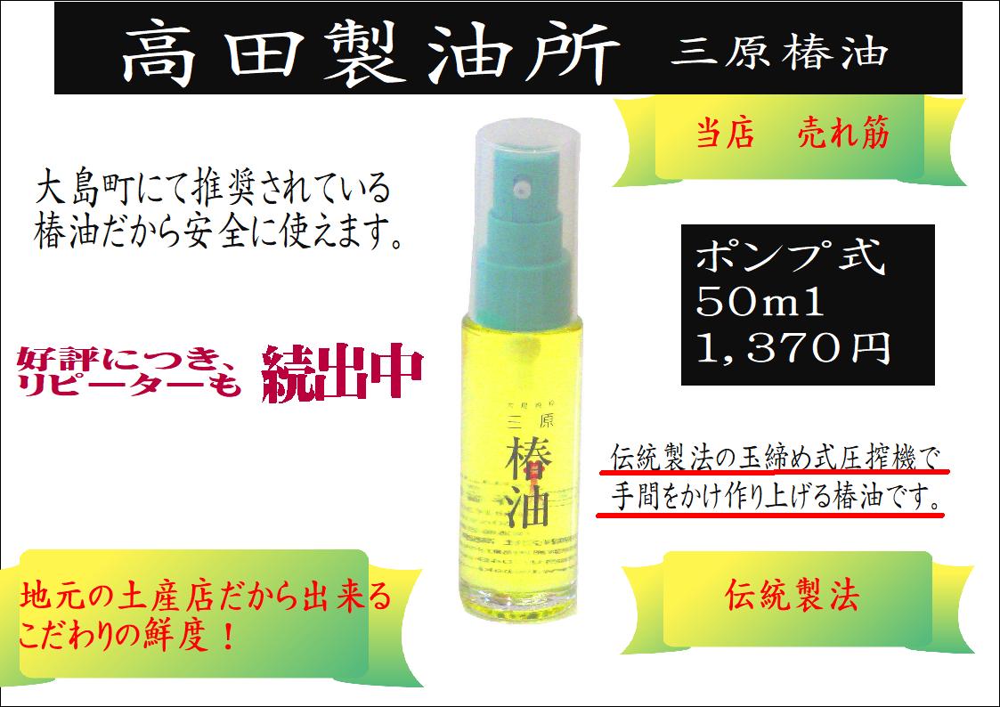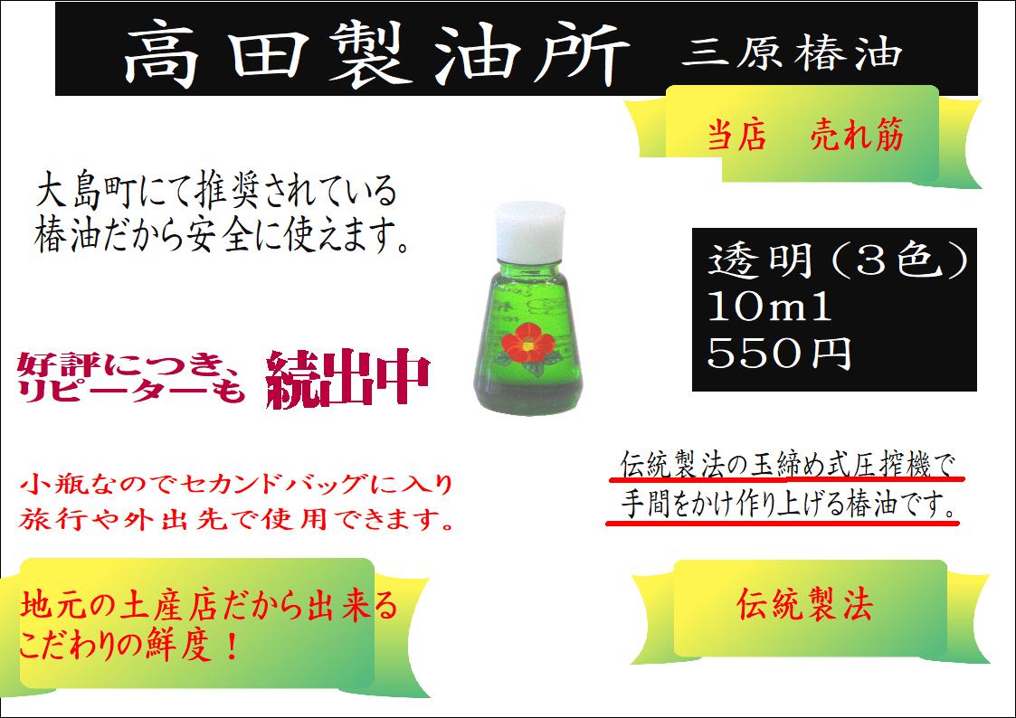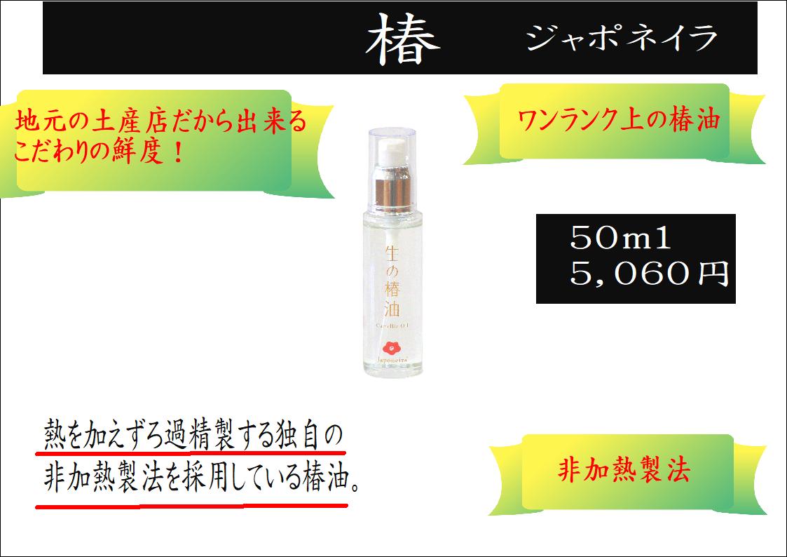 - 高田製油所:三原椿油、椿:ジャポネイラ、